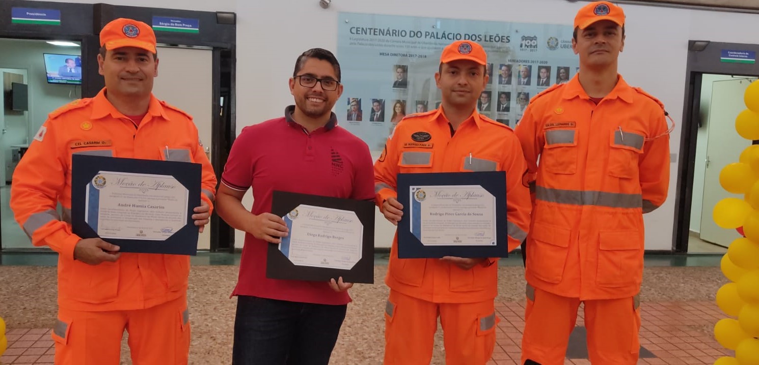 Moção de aplausos realizada nesta manhã na Câmara Municipal de Uberlândia. Homenagem realizada à RINEM pelos seus 3 anos de existência e relevantes serviços prestados à sociedade uberlandense. Receberam a homenagem alguns integrantes da rede, sendo Comandante do 2° COB - Coronel BM André Húmia CASARIM e Comandante do 5° BBM Tenente - Coronel BM LEONARDO Teixeira Leão, o Assessor Administrativo Soldado Rodrigo Pires e o presidente da RINEM Diego Rodrigo Borges. Parabéns a todos os envolvidos nesta conquista!