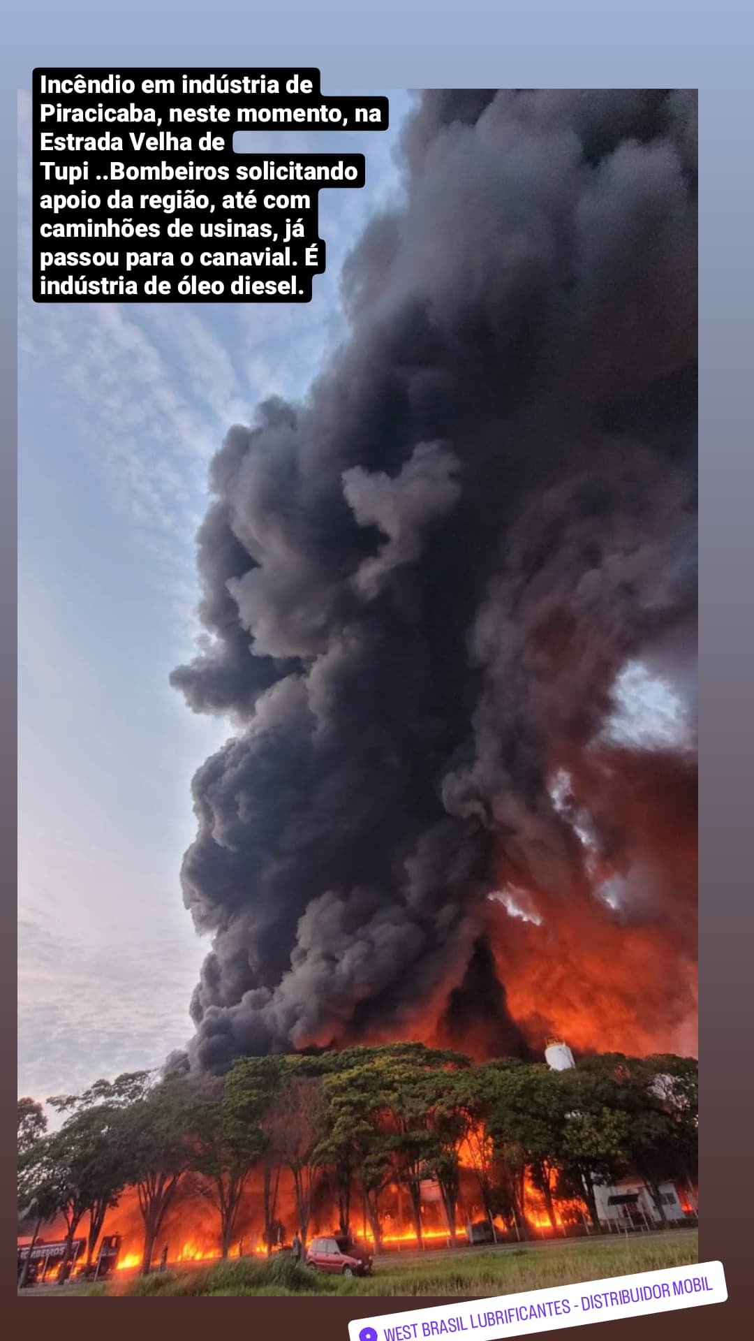 "[Fogo se espalhou] bem rápido, até por se tratar de uma empresa com bastante óleo lubrificante, combustíveis. Já pegou alguns reservatórios de óleo e se propagou rapidamente. Bastante óleo, acabou escorrendo para propriedades vizinhas", disse o capitão dos Bombeiros de Piracicaba, Fábio Henrique Giovani.